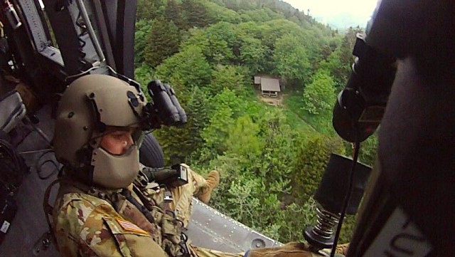 Tennessee Army National Guard Black Hawk helicopter crew chief Sgt. Daniel Bandy prepares to lower flight paramedic Sgt. 1st Class Giovanni DeZuani by hoist to rescue a hiker in cardiac distress at the Double Spring Gap Shelter in the Great Smoky Mountains National Park June 12, 2024. (submitted photo)