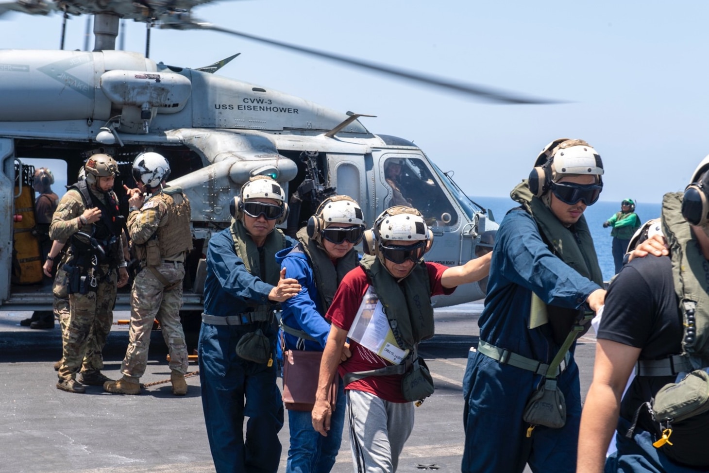 A helicopter from Helicopter Maritime Strike Squadron (HSM) 74 airlifted 24 civilian mariners from Tutor to Ticonderoga-class guided-missile cruiser USS Philippine Sea (CG 58). From there, helicopters from Helicopter Sea Combat Squadron (HSC) 7 transported the group to USS Dwight D. Eisenhower (CVN 69). After being medically checked on IKE, the mariners were flown ashore for follow-on care.