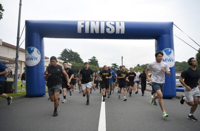 Runners take off from the start line of the Army Week 5K Fun Run held June 13 on Camp Zama, Japan. More than 50 youth and adult runners, including Soldiers, civilians, family members, Japanese employees and Japan Ground Self-Defense members, came out for the event.