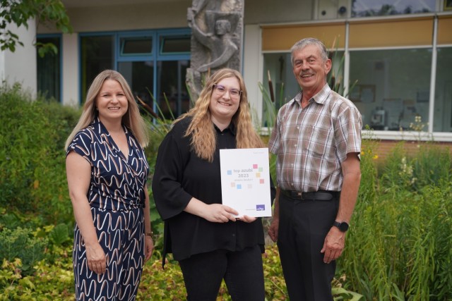 Former trainee Kathrin Schertl (in the middle) together with her school teacher Ivonne Voelkl (on the left) and on the job trainer Hans Pappenberger (on the right) during the recognition ceremony, July 19, in Weiden.