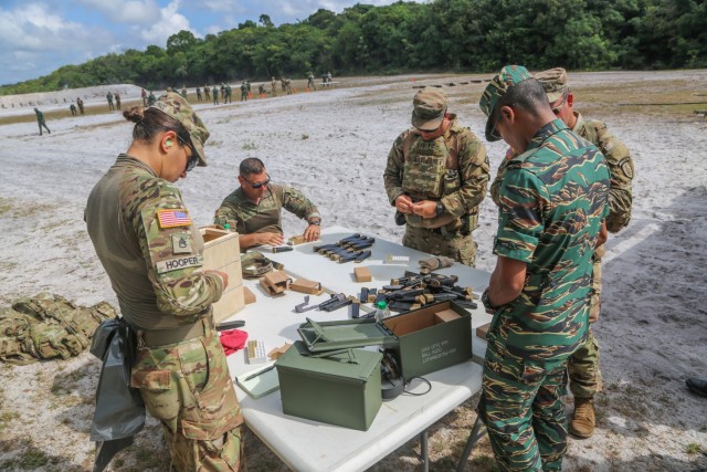 Florida National Guard Soldiers from the 54th Security Force Assistance Brigade prepare for a live-fire exercise to train multinational partners from Guyana, Antigua and Barbuda Merchant Marines at Camp Seweyo, Guyana, July 21, 2023.