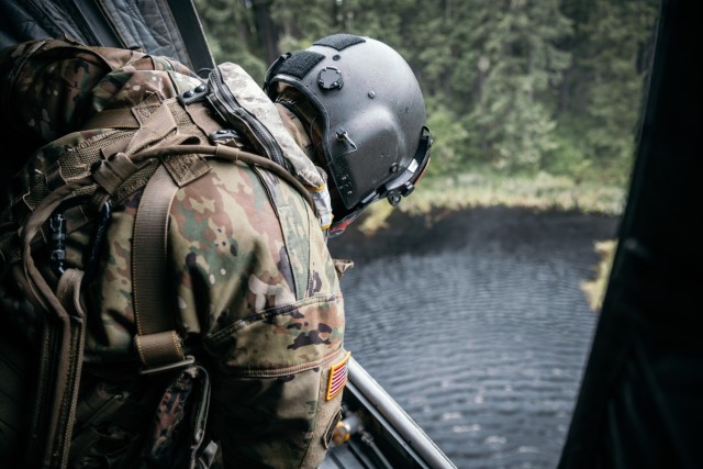 Washington National Guard Sgt. Nathan Smart a member of B Company, 1st Battalion, 168th General Support Aviation, checks the water bucket level during wildfire air operations training June 6, 2021, at Joint-Base Lewis McChord, Washington.