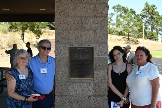 Left to right: Mrs. Diane Griffin, mother of Sgt. 1st Class Jeremy Griffin, Mr. Charles Griffin, father of Sgt. 1st Class Jeremy Griffin, Miss Makayla Griffin, daughter of Sgt. 1st Class Jeremy Griffin, and Ms. Amy Griffin, wife of Sgt. 1st Class Jeremy Griffin, stand beside the Griffin Field dedication plaque, Presidio of Monterey, Calif., July 2.
