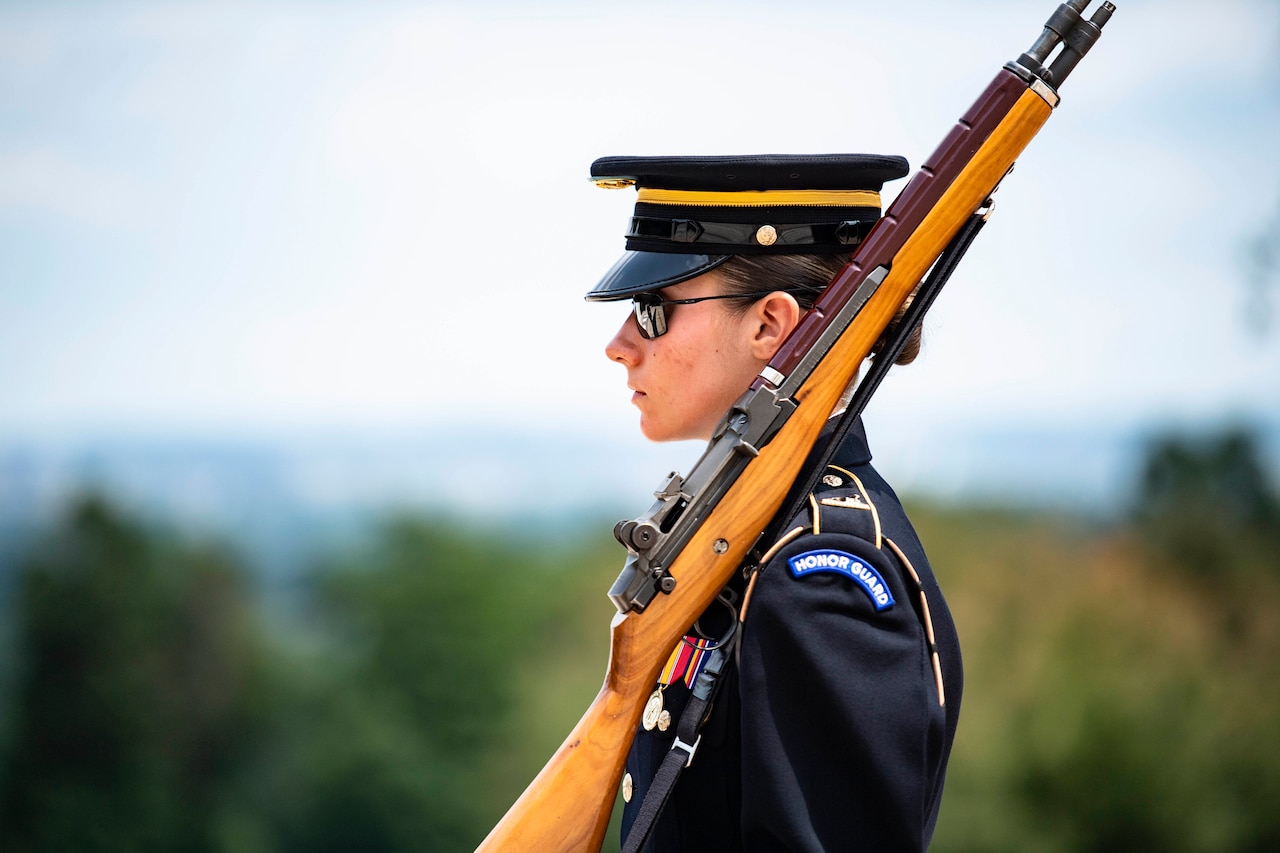 Army Pfc. Jessica Kwiatkowski leaned forward as she walked against the wind and rain. As a Tomb Guard with the 3rd U.S. Infantry Regiment, she walked her twenty-one steps in front of the Tomb of the Unknown Soldier at Arlington National Cemetery in the middle of a violent rainstorm on the evening of Saturday, July 29, 2023. Amid the storm, she walked her post without the ability to see.