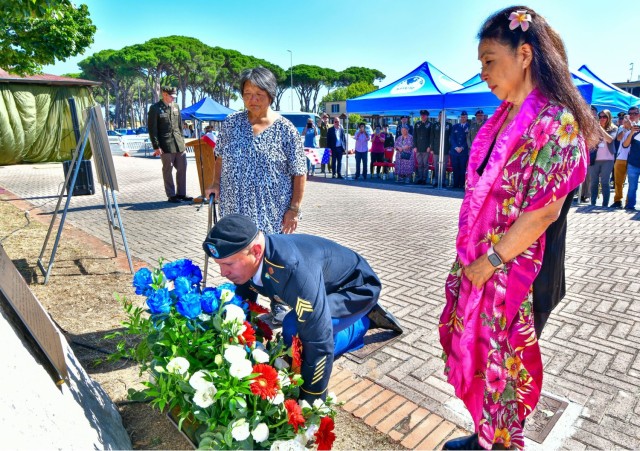 Yoko Sakato and Valerie Matsunaga, both family members of the 442nd Regimental Combat Team, a segregated U.S. Army unit whose troops were of Japanese descent – known as Nisei –took part in the July 11 commemoration event at Camp Darby, near Pisa, Italy