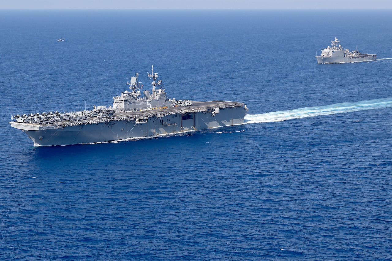 According to a news release from U.S. Central Command, an amphibious assault ship, such as the USS Bataan, can carry more than two dozen rotary-wing and fixed-wing aircraft. That could include MV-22 Osprey tilt-rotor aircraft and AV-8B Harrier attack jets, in addition to several amphibious landing craft. A dock landing ship, such as the USS Carter Hall, also supports operations for various rotary-wing aircraft, tactical vehicles, and amphibious landing craft.