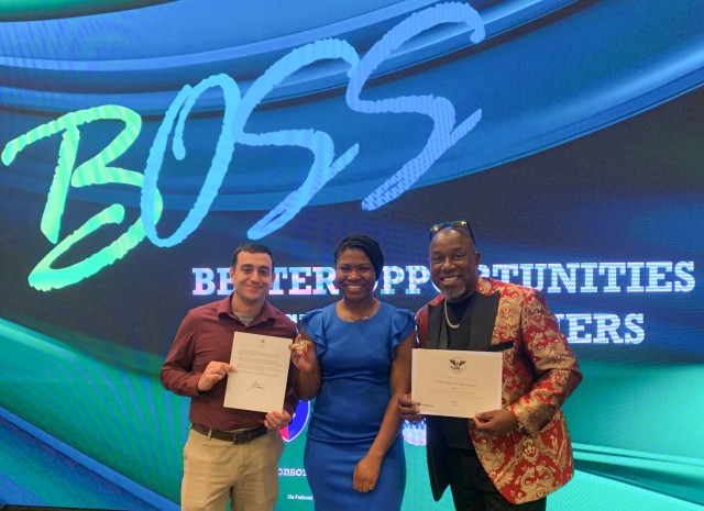 Command Sgt. Maj. David A. Rio, left, senior enlisted leader of U.S. Army Garrison Japan, accepts the President’s Volunteer Service Award along with Camp Zama’s Better Opportunities for Single Soldiers program president, Spc. Myaisa Mason, and its advisor, Randy Benton, during the annual BOSS Training Forum held in June 2024 in Leesburg, Virginia.