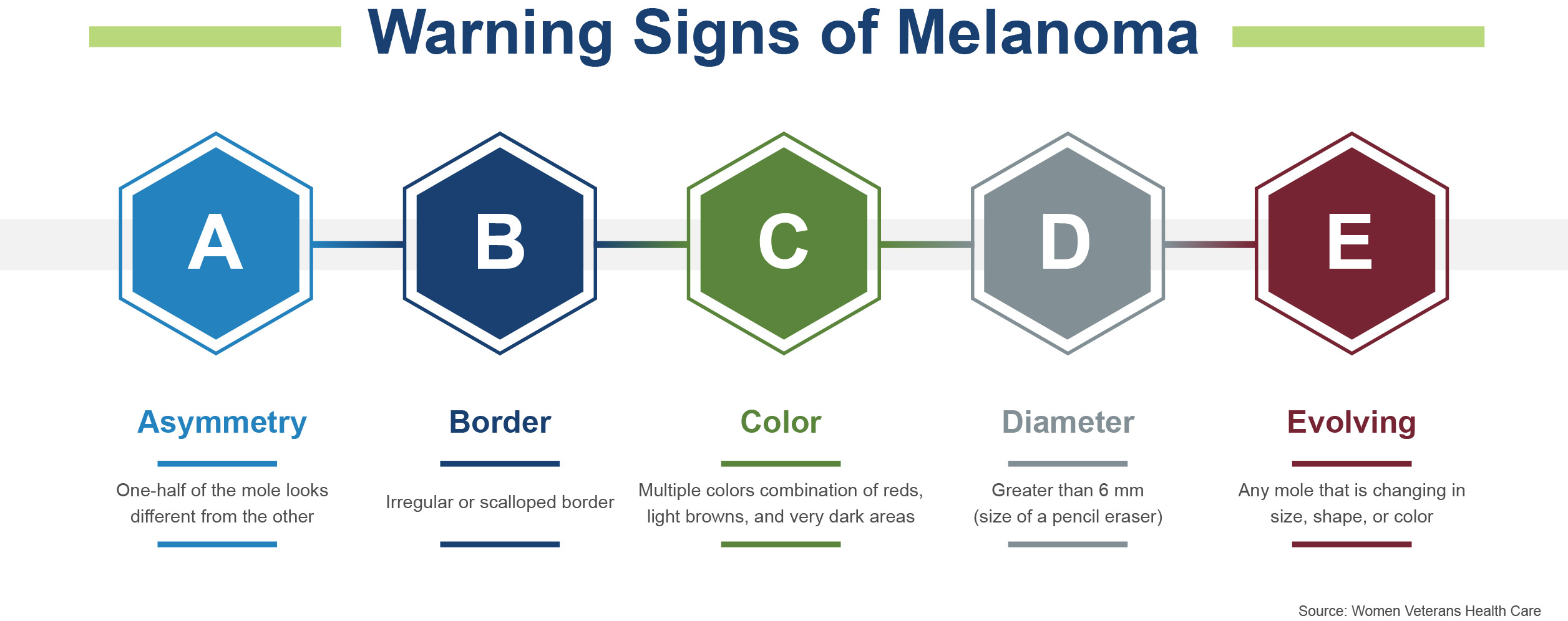 You should let your VA provider know of any changes on your skin or any concerns about your skin, and they can check for lesions with warning signs of melanoma and other skin conditions.