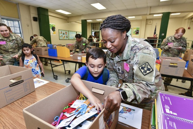 Families arrived at the school where they were greeted by the 187th Medical Battalion Command Team Lt. Col. Sean Riley and Command Sgt. Maj. Jeremy Conn who welcomed the students. After receiving new backpacks the students went to the school cafeteria where battalion Soldiers and civilians helped them fill their backpacks with school supplies. Afterwards the students and their parents visited with their classroom teachers.