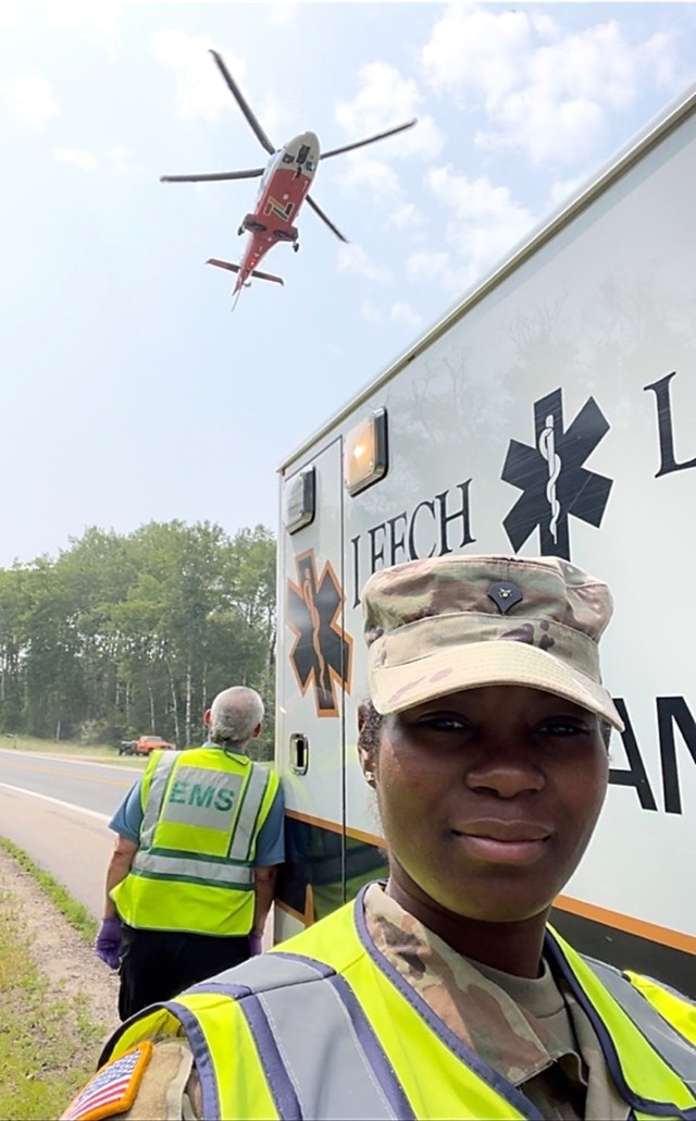 U.S. Army Reserve Spc. Ana Baker, a healthcare specialist, assigned to the 399th Field Hospital, 803rd Hospital Center, 804th Medical Brigade, 3rd Medical Command takes a self-portrait as a life-flight helicopter lands in the background at the scene of a motor vehicle accident that Baker was dispatched to during a ride along with an Ambulance Service. Baker was with her unit in Cass Lake, Minnesota, conducting a real-life medical assistance mission with the local civilian community providing no cost dental and medical care as part of an Innovative Readiness Training (IRT) mission. The IRT was part of Operation Walking Shield, a joint medical assistance operation with the Minnesota Army National Guard. (Official U.S. Army Reserve photo by Spc. Ana Baker)