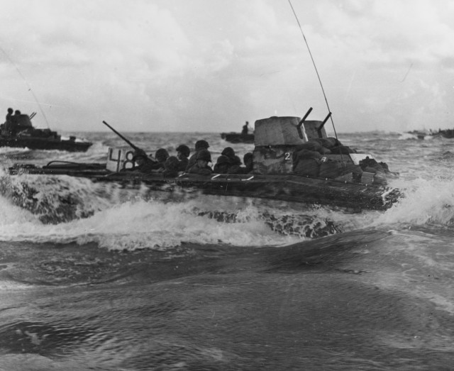 LVT carrying assault troops from Saipan to Tinian. More than half of the 140 LVTs used to Land the assault force were crewed by the U.S. Army. The Tinian invasion is the only major amphibious assault to be launched from land by LVTs that transited the three nautical miles from Saipan to Tinian.