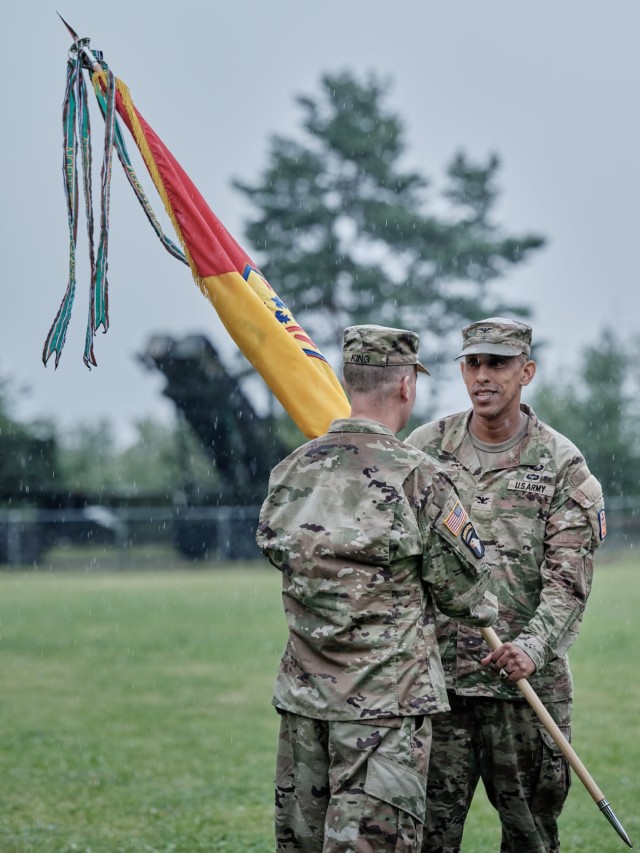 U.S. Army Command Sgt. Maj. Charles Robinson, the 52D ADA BDE Command Sgt. Maj., passes the guidon to COL. Bruce Bredlow, the previous 52D ADA BDE commander, during a change of command ceremony Aug. 1, 2024, in Sembach, Germany. Col. Hailey Bairu assumed command of 52D Air Defense Artillery Brigade from Col. Bruce Bredlow.
