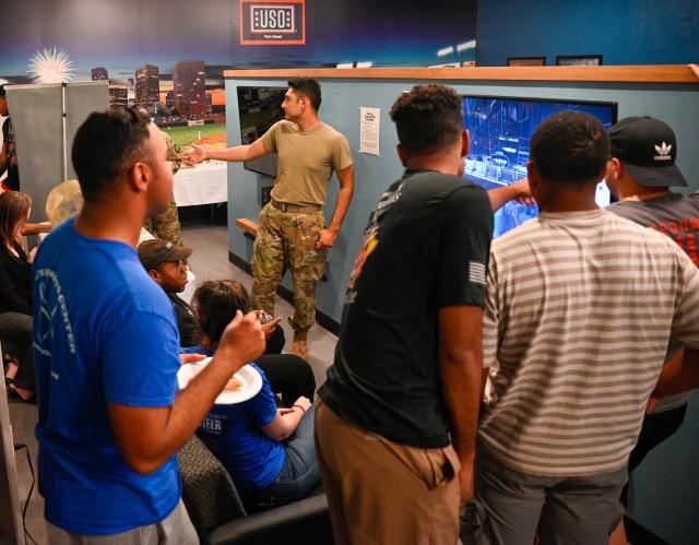 As the Apex showdown against JBSA looms, a group of Soldiers gather in the game room of the Fort Cavazos USO. Engrossed in discussion, they strategize and share insights in anticipation of the upcoming match. (U.S. Army photo by Eric Franklin, Fort Cavazos Public Affairs)