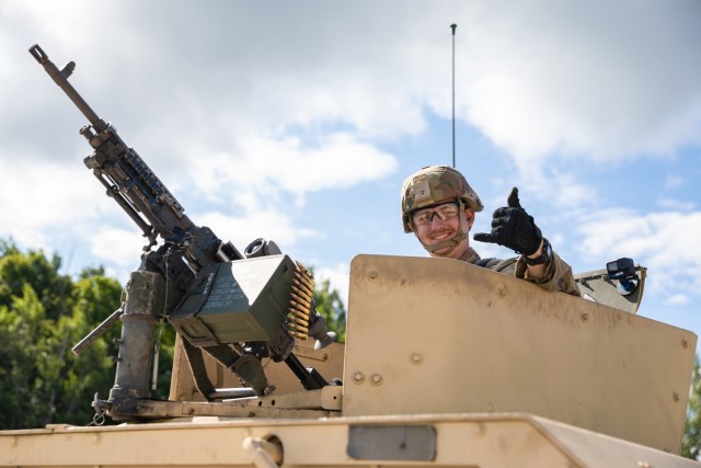 During gunnery, vehicle crews traverse the live-fire range’s maneuver area, also known as the maneuver box or “the box.” While in the box, the crews patrol from their vehicles, scanning for potential threats. They conduct defensive operations and repulse enemy attacks with their vehicle’s assigned weapon system — in this case, a .50-caliber M2 Browning machine gun or a 7.62mm M240L machine gun. They also conduct offensive operations, assaulting enemy positions.