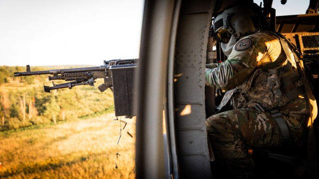 U.S. Army Spc. Austin Banks fires the M240 machine gun during mounted gunnery in a UH-60 Black Hawk at Camp Grayling Army Airfield in Grayling, Michigan, July 16, 2024. Banks, a crew chief in Bravo Company 2/147th Assault Helicopter Battalion, 63rd Theater Aviation Brigade, was conducting aerial gunnery during annual training. (U.S. Army National Guard photo by Sgt. 1st Class Andrew Dickson)