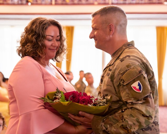 Command Sgt. Maj. Stephen LaRocque, outgoing command sergeant major for U.S. Army Garrison Rheinland-Pfalz, presents a bouquet of red roses to his wife Nicole during his relinquishment of responsibilities ceremony held Aug. 25 at Armstrong Club in Kaiserslautern, Germany. Red roses are traditionally given to the outgoing commander or command sergeant major’s spouse to signify the bonds of loyalty and affection between the command and the commander/command sergeant major’s spouse. (Photo Credit: Linda Lambiotte)