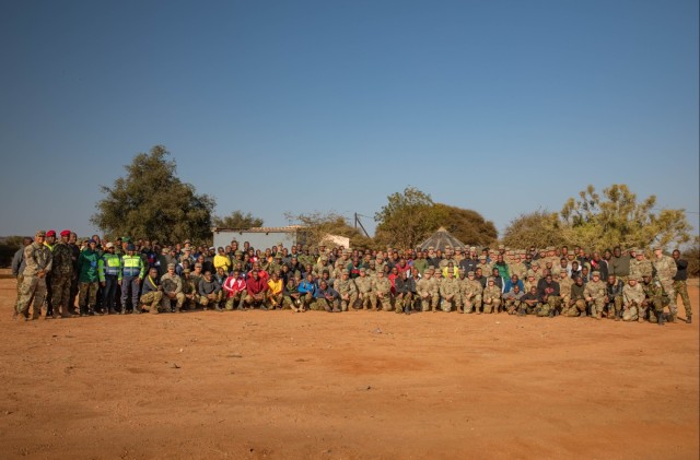 U.S. Army Soldiers with the North Carolina National Guard pose for a group photo with members of the Botswana Defence Force after a joint clean-up effort of Shoshong during exercise Southern Accord 2024 in Shoshong, Botswana, Aug. 10, 2024. Southern Accord 2024 is a bi-annual joint exercise sponsored by U.S. Africa Command and led by U.S. Army Southern European Task Force, Africa (SETAF-AF). Running from Aug. 5-15, the exercise brings together U.S. Army and Air Force personnel and Botswana Defence Force counterparts to conduct a variety of training to include humanitarian assistance, disaster relief, as well as peacekeeping and aeromedical evacuation. The exercise is designed to enhance bilateral military capabilities and interoperability. (U.S. Army photo by Sgt. Alisha Grezlik)