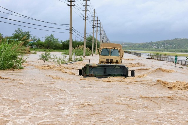 Soldiers assigned to the India Company, 1-296th Infantry Regiment, rescued 10 people stranded on the border of Cabo Rojo and Hormigueros Municipalities due to the flooding of another river. Those rescued included personnel from the Cabo Rojo Emergency Management Office and LUMA Energy, a local power company.
