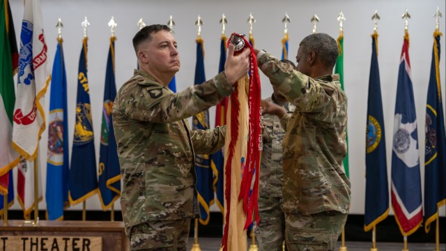 Capt. Michael Ranger and 1st Sgt. Manuel Morales, command team of the Headquarters and Headquarters Company, 13th Armored Corps Sustainment Command, uncase the company guidon during a Transfer of Authority ceremony from the 143d Expeditionary Sustainment Command to the 13th ACSC at Camp Arifjan, Kuwait, on Sept. 2, 2023. The rotational ESC or ACSC is the 1st Theater Sustainment Command’s permanent forward deployed presence, combined with rotational augmentation from 1st TSC’s Main Command Post at Fort Knox, KY. These two rotational elements combine to form what is known as the 1st TSC Operational Command Post. The OCP is responsible for executing routine sustainment mission command across the U.S. Central Command theater in coordination with the 1st TSC MCP. (U.S. Army Reserve photo by Capt. Katherine Alegado) (Photo Credit: Capt. Katherine Alegado)