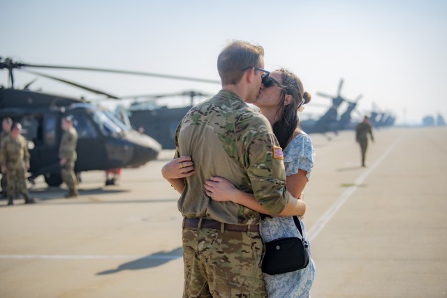Family, friends and coworkers gathered on Gowen Field Aug. 22, 2024, to say farewell to Soldiers from the Idaho Army National Guard’s 1st of the 183rd Assault Helicopter Battalion as they left Idaho to prepare to deploy overseas to support Operation Joint Guardian. Several UH-60M Black Hawk helicopters and more than 100 personnel deployed to Texas for additional training before departing to Kosovo for an 11-month rotation supporting the NATO peacekeeping mission.(U.S. National Guard photo by Master Sgt. Becky Vanshur)