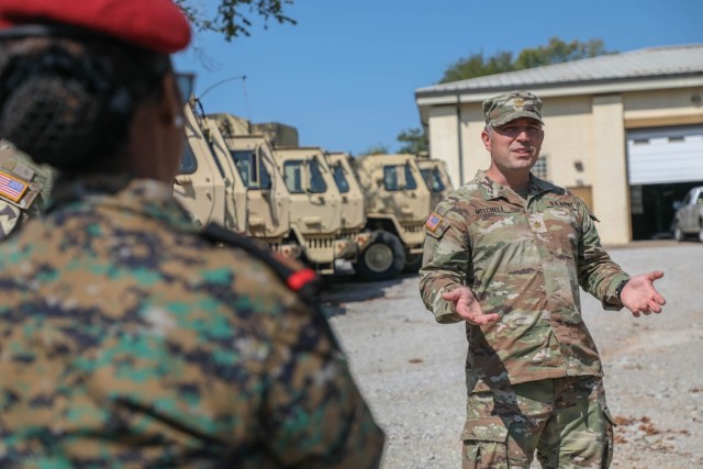 Maj. Joshua Mitchell, battalion executive officer, speaks to logistics officers from the Djiboutian Armed Forces who visited the 1792nd Combat Support Sustainment Battalion in Bowling Green, Ky., Aug. 22, 2024. The visit was part of the Department of Defense National Guard Bureau State Partnership Program.