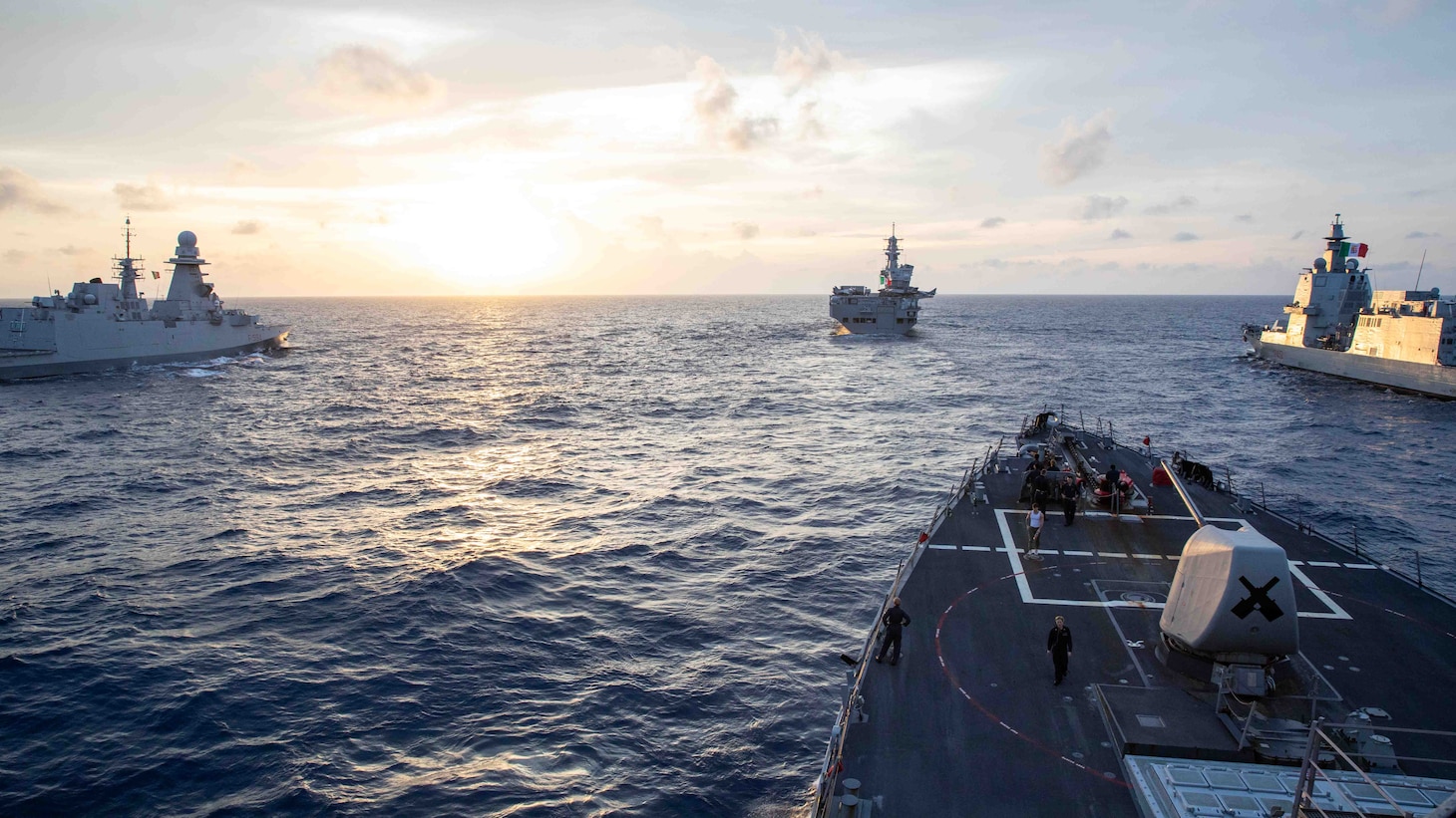Participants included the U.S. Navy Arleigh Burke-class guided-missile destroyer USS Russell (DDG 59), P-8A Poseidon Maritime Patrol Aircraft from the Royal Australian Air Force, the flagship of the Italian navy aircraft carrier ITS Cavour (CV 550), the Italian navy Carlo Bergamini-class frigate ITS Alpino (F 594), and the Italian multipurpose combat ship ITS Raimondo Montecuccoli (P432).