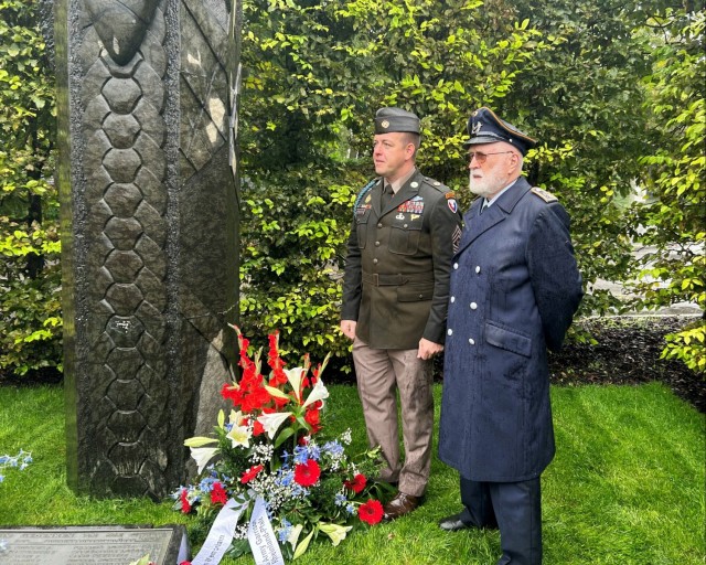 Command Sgt. Maj. Raymond Wrensch, U.S. Army Garrison Rheinland-Pfalz, along with a group of retired uniformed members of the Bundeswehr, assembled at the stele, where flower arrangements and wreaths were placed in preparation for the official commemoration.