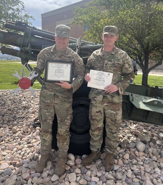 Staff Sgts. Ian Wilding, Delta Company 141st Brigade Support Battalion, and Chris Yoder, Fox Company 181st Brigade Support Battalion, show off their awards following the 2024 National Guard Best Mechanic of the Year competition at Camp Williams, Utah, Aug. 25, 2024. Wilding took top honors; Yoder finished fourth out of 26 competitors. (Courtesy Photo)