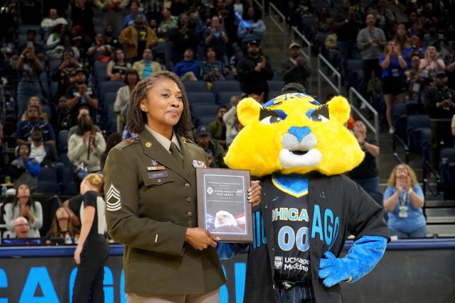 CHICAGO – “Representing the Army Reserve tonight at a Chicago Sky game in my hometown, in front of my family, was a humbling experience and incredible opportunity,” said Master Sgt. Vicky Brown, 85th U.S. Army Reserve Support Command.