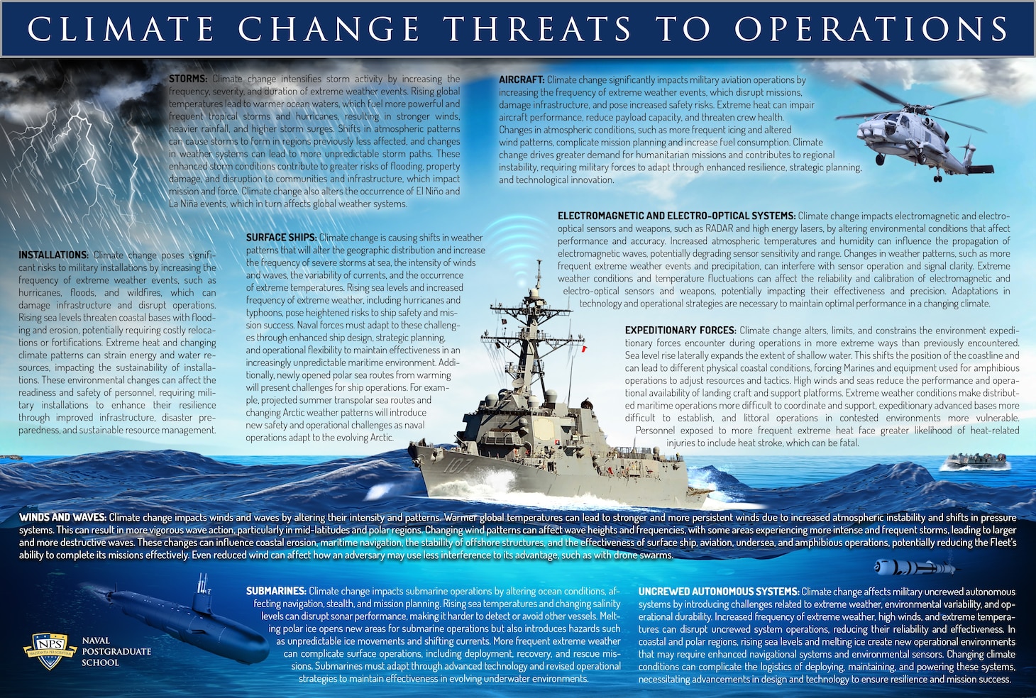 The land, sea, and air are essential environments where the Navy and Marine Corps must operate, and the effects of climate change are increasingly shaping environmental conditions. Threats come from all directions and can adversely impact many operations, such as those conducted by surface ships, aircraft, submarines, expeditionary forces, uncrewed autonomous systems, and more.