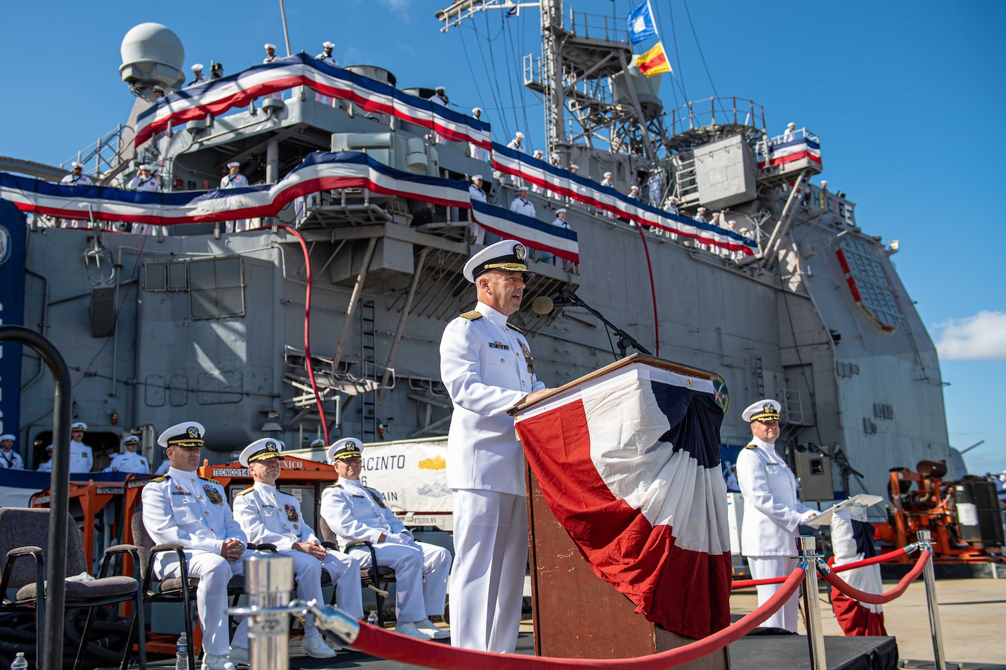 Vice Adm. Jim Kilby, deputy commander, U.S. Fleet Forces Command, who previously served two tours aboard San Jacinto, presided over the ceremony and provided keynote remarks.