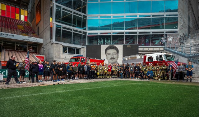 U.S. Army photo of portraits displayed in honor of the 343 New York City firefighters who died during the attack on the World Trade Center Sept. 11 at the Fritz Walter Stadium. U.S. Army Sgt. Maj. John Nyguen, Sgt 1st Class Jordan Schulze, Staff Sgt. Brittany Holdbrools, Staff Sgt. Deontae Stephens, Sgt. Tyler Fields, and Spc. Nicolas Sarolas climbed 2,071 steps, equaling the number to get to the top of the 110-story twin towers (U.S. Army photo by Sgt. Yesenia Cadavid). (Photo Credit: Sgt. Yesenia Cadavid)