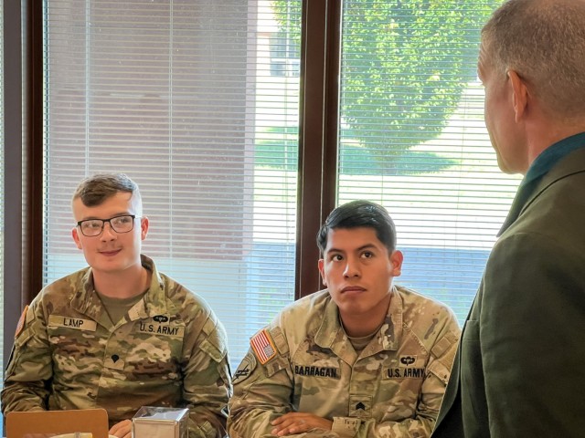After competing against Grinston in a physical training competition during basic training at Fort Leonard Wood, Spc. Nathan Skipworth, with 54th Brigade Engineer Battalion, 173rd Airborne Brigade, was happy to see a familiar with Grinston’s visit so close to his promotion to Sergeant.