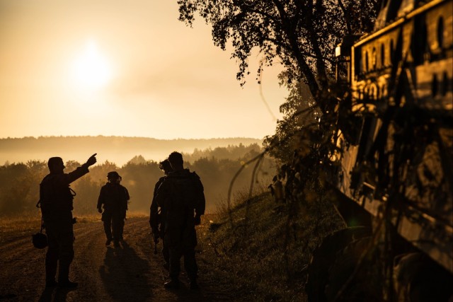 U.S. Army soldiers attached to 2nd Platoon “Palehorse”, 4th Squadron, 2nd Cavalry Regiment, rally together to plan the next step of operations during Saber Junction at Hohenfels, Germany, Sept 16, 2023. Saber Junction 2023 is an annual exercise designed to increase 2CR lethality, capabilities and readiness to deter aggression in support of NATO’s collective deterrence and defense initiatives. (Photo Credit: U.S. Army photo by Sgt. Kenneth Rodriguez)