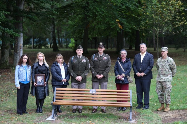 Col. Jeffery Higgins, the commander of U.S. Army Garrison Rheinland-Pfalz, and Command Sgt. Maj. Raymond Wrensch, the senior enlisted advisor for USAG Rheinland-Pflaz, stand alongside Gold Star family members behind a park bench at Pulaski Park, Kaiserslautern, Germany, Sept. 27, 2024. USAG Rheinland-Pfalz dedicated a park bench to Gold Star family members during a Gold Star Mother’s and Family Day recognition ceremony.