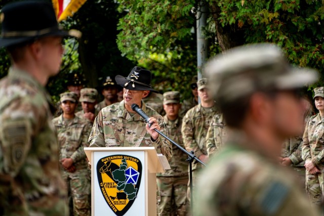 Maj. Gen. Thomas M. Feltey, Commanding General of the 1st Cavalry Division, speaks during the 1st Cavalry Division Sustainment Brigade change of command ceremony on Forward Operating Site Powidz, Poland, Sept. 27, 2024. Change of Command ceremonies are a long-standing Army tradition that allows unit Troopers to see the new commander and know that their old commander relinquished command. Col. Jones originally assumed command of the brigade on Nov. 29, 2022, and his replacement, Col. Fisher, is returning to the brigade as its commander after working on the logistics side of Operation Inherent Resolve Combined Joint Task Force. (U.S. Army photo by Sgt. Jacob Nunnenkamp) (Photo Credit: Sgt. Jacob Nunnenkamp)