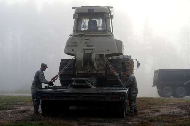 Staff Sgt. Parker Kessel (left) and Staff Sgt. Joseph Armstrong (right) from the 357th Engineer Company secure a military DR7 II CAT Dozer onto a transport trailer on October 5, 2024, before moving out it to clear debris from a nearby road where residents were trapped. The Army Reserve engineers were deployed early in the morning to restore road access for the local community in Burnsville, North Carolina (Yancey County). (Photo Credit: Lt. Col. William Wratee)