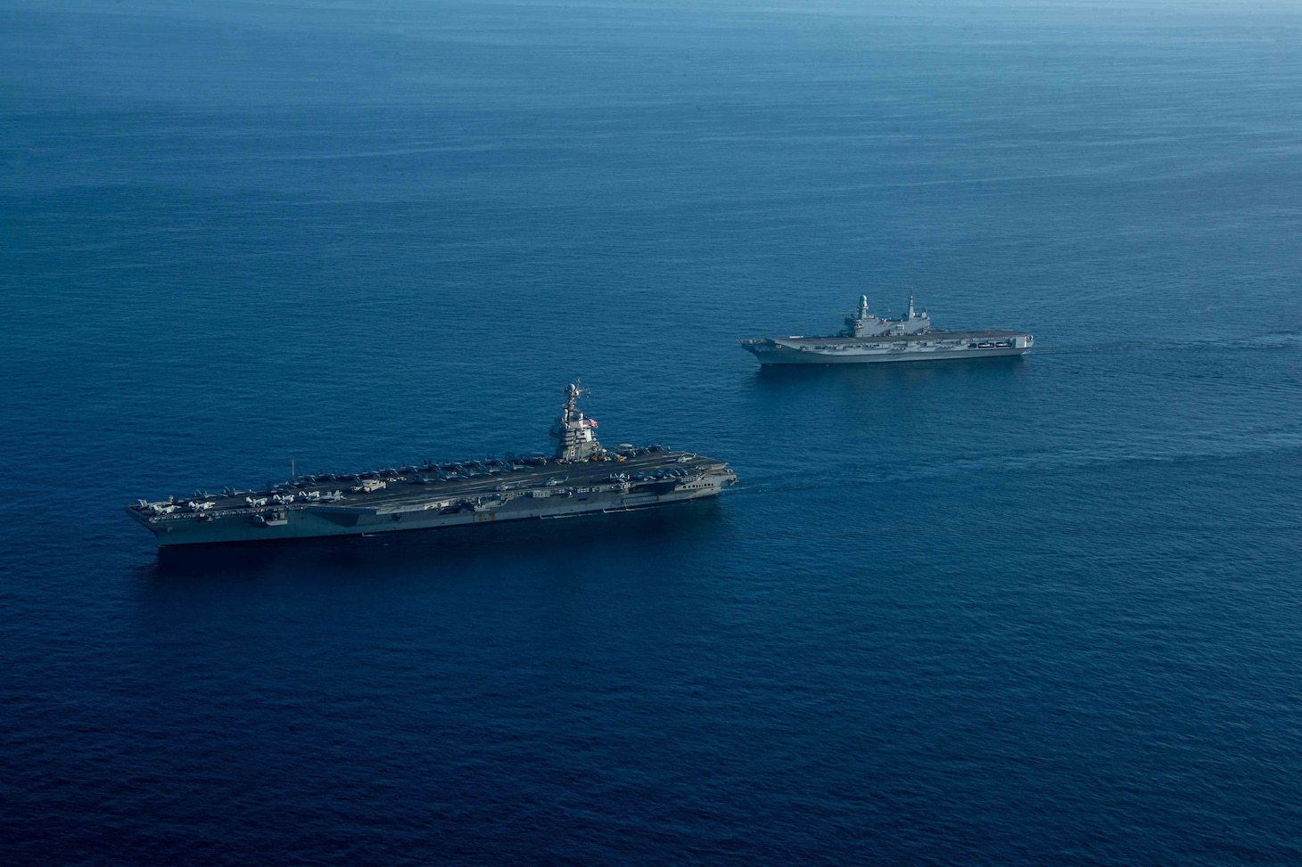 The world’s largest aircraft carrier USS Gerald R. Ford (CVN 78), the Ticonderoga-class guided-missile cruiser USS Normandy (CG 60), the Arleigh Burke-class guided-missile destroyer USS Ramage (DDG 61), and squadrons assigned to Carrier Air Wing (CVW) 8 participated with Italian Navy flagship ITS Cavour (CVH 550), Italian Orizzonte-class guided-missile destroyer ITS Caio Duilio (D 554), and Italian Bergamini-class guided-missile frigate ITS Virginio Fasan (F 591).