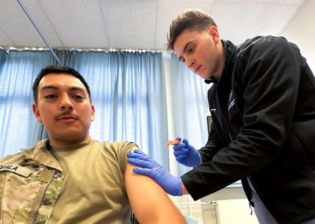 U.S. Air Force Airman 1st Class Kevin Donovan, an aerospace medical technician assigned to Landstuhl Regional Medical Center’s Medical, Surgical, Pediatric Inpatient Ward, administers an influenza vaccine to U.S. Army Sgt. Jairo Zavala, a cargo specialist with 1st Inland Cargo Transfer Company, 39th Transportation Battalion, 21st Theater Sustainment Command, during the seasonal flu vaccination event at LRMC, Oct. 4.