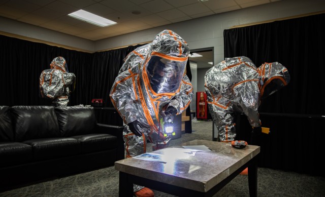 Members of the Kosovo Security Force Hazardous Materials Company discover clues that lead to a planted, homemade explosive device in a training scenario in Wells Fargo Arena in Des Moines, Iowa, Sept. 21, 2023. The KSF worked with the 71st Civil Support Team, Iowa National Guard — their partners in the Department of Defense National Guard Bureau State Partnership Program. (U.S. Army National Guard photo by Sgt. Rachel I. White)