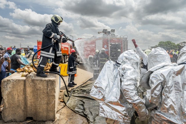 Members of the Ghana National Fire Service decontaminate victims so the National Ambulance Service can safely interact with them during Lignite Coast 2022 Preparedness Exercise “Shikpon Wosomo”, at the Tema Canoe Harbor, Ghana, June 21, 2022. The exercise was conducted in partnership with the North Dakota National Guard State Partnership Program. (U.S. Army photo by Sgt. Michaela C.P. Granger)