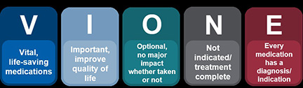 VIONE stands for the five categories used to evaluate medications: Vital, Important, Optional, Not needed, and Every (medication has an indication).