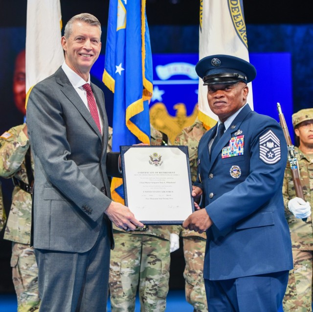 Air Force Gen. Steven Nordhaus, who recently became the 30th chief of the National Guard Bureau, presided over the ceremonies that celebrated Whitehead’s career and ushered in a new era of enlisted leadership at the NGB.