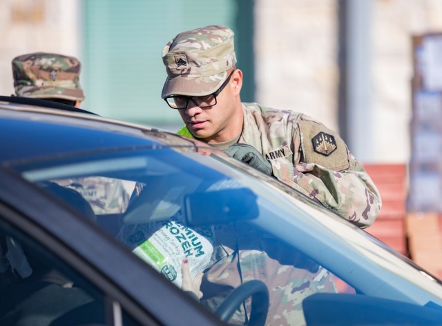 At 9 a.m. a line of cars that wrapped around the Main Post Chapel began moving through the drive-thru distribution area, where they received fresh produce, their fixings, pies donated by H-E-B and a turkey.