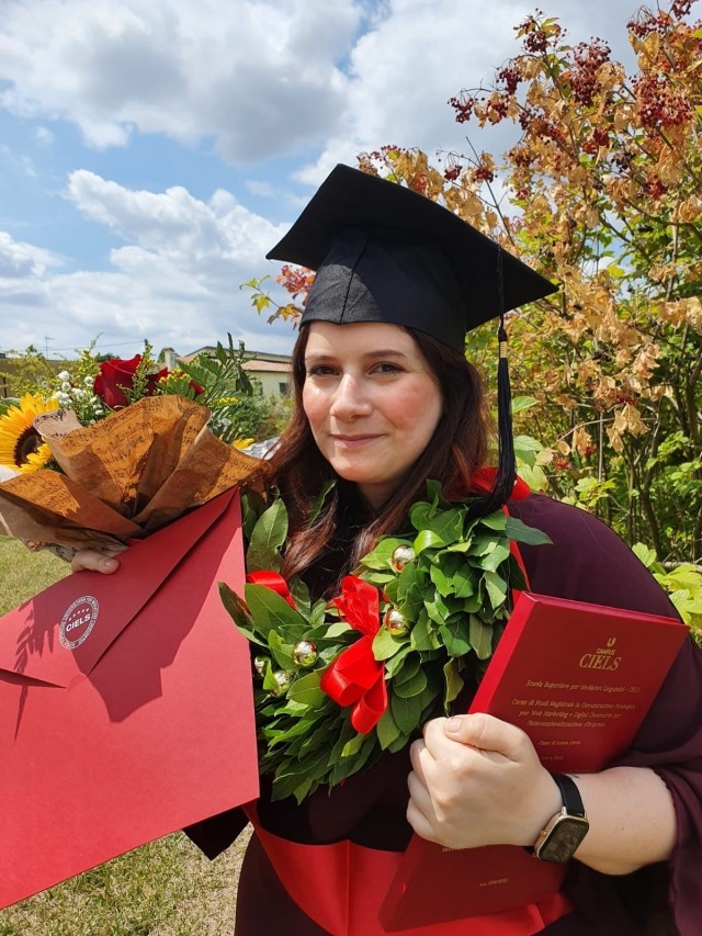 Elena Esposito, the administrative support assistant at Logistics Readiness Center Italy, celebrates her graduation from CIELS University for Linguistics Mediators in Padova, Italy, where she received a master’s degree in translation and interpreting. Esposito was recently selected as LRC Italy’s employee of the quarter (junior grade) for 4th quarter, fiscal year 2023.