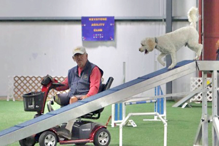This Marine was not going to let life obstacles keep him down. Nearly two years after his surgery, a friend acquired a new dog, and she talked Godshall into training him to run agility while handling him from a motorized scooter. The new dog, Franco, was a Cocker Spaniel/Poodle mix (named for Pittsburgh Steelers running back Franco Harris). Franco demonstrated the confidence to take instruction from a distance.