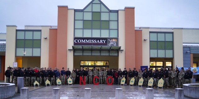 From turkeys, stuffing, pasta sauce and plates, more than 100 NCOs gathered earlier that morning to stock shelves to make sure the Tower Barracks Commissary was fully stocked.