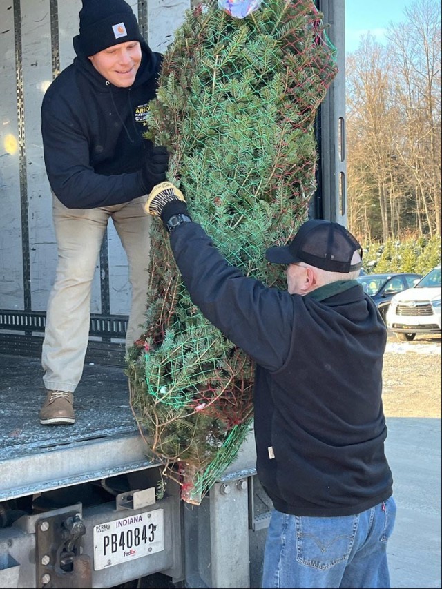 New York Army National Guard Spc. Matt Clark lifts a donated Christmas tree from retired Command Sgt. Maj. Bob Van Pelt during the annual Trees for Troops loadout at Ellms Tree Farm in Ballston Spa, New York, Dec. 2, 2024. Tree farmers from New York’s capital and Saratoga regions donated 125 trees to be sent to military bases for the holidays. (U.S. Army National Guard photo by Lt. Col. Jean Marie Kratzer.)