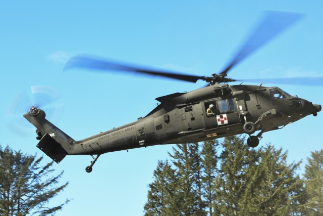 An Oregon Army National Guard HH-60M Black Hawk helicopter takes off from a landing zone during the 2022 Best Warrior Competition, March 19, 2022, at Camp Rilea near Warrenton, Ore. (Air National Guard photo by John Hughel, Oregon Military Department)