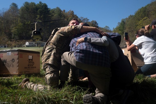 U.S. Army Sgt. Isaac Bradshaw, a combat medic with C Company, 230th Brigade Support Battalion, North Carolina Army National Guard, wraps his arms around an older couple and uses his body to block them from debris and strong winds produced by the rotor wash of a landing CH-47 Chinook helicopter in Burnsville, North Carolina, Oct. 10, 2024. The Chinook crew responded in the aftermath of Hurricane Helene, bringing generators, fuel, and other supplies to the remote area that was isolated when floodwaters washed away the main road in and out of the area. (U.S. Army photo by Sgt. 1st Class Jon Soucy)